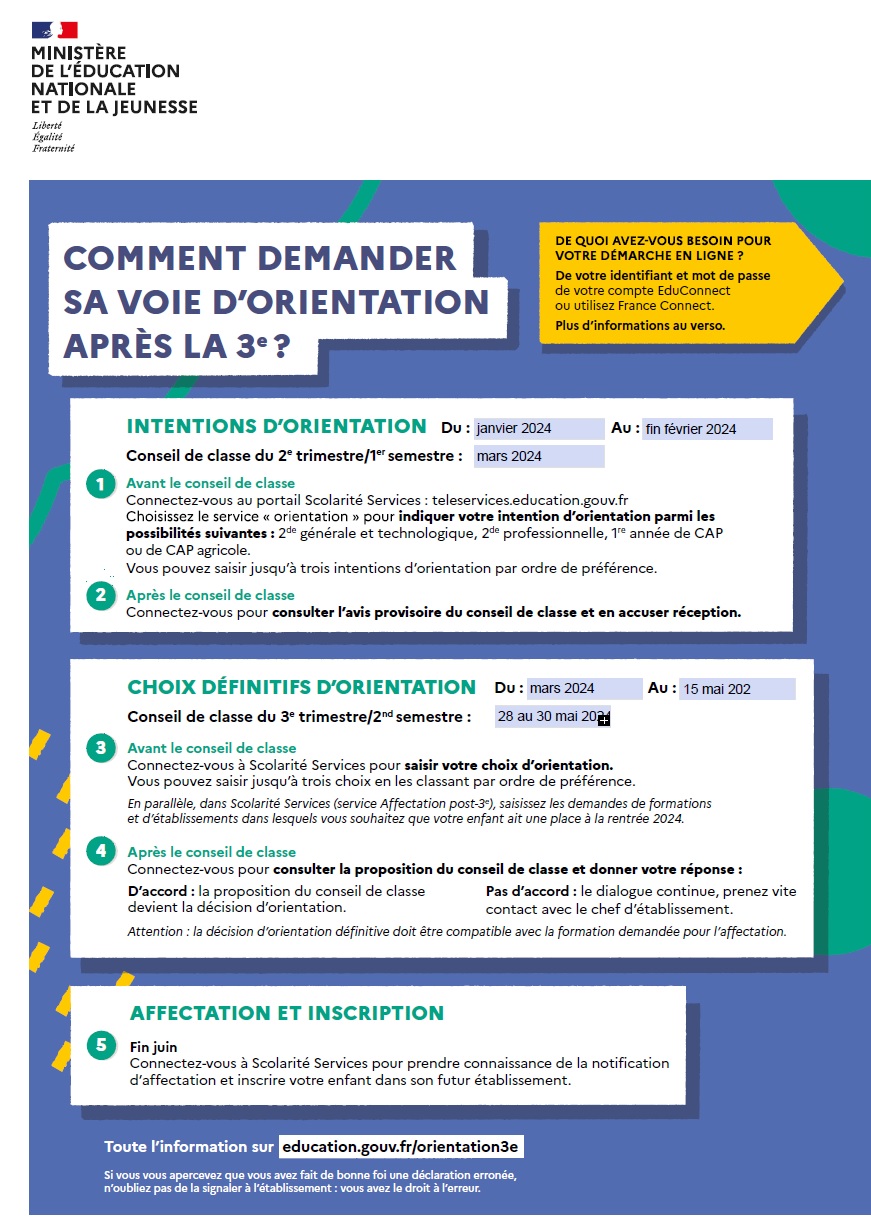 Dans le cadre de l'orientation après la 3ème, vous trouverez des documents ressources ci-joints. Vous pouvez d'ores et déjà parcourir ces documents qui seront expliqués lors de notre réunion d'orientation du mardi 16 Janvier 2024 ou cliquez ici