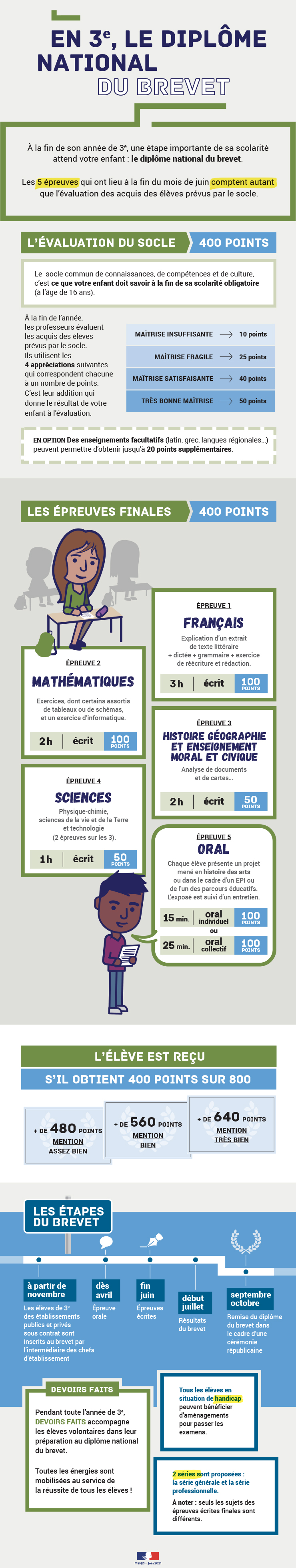 Le diplôme national du brevet évalue les connaissances et les compétences acquises à la fin du collège. Il est équilibré entre évaluation du socle (contrôle continu) et épreuves finales. Chaque discipline évaluée fait l'objet d'une épreuve distincte, sauf en sciences (deux disciplines), et d'une épreuve orale pour les candidats scolaires.