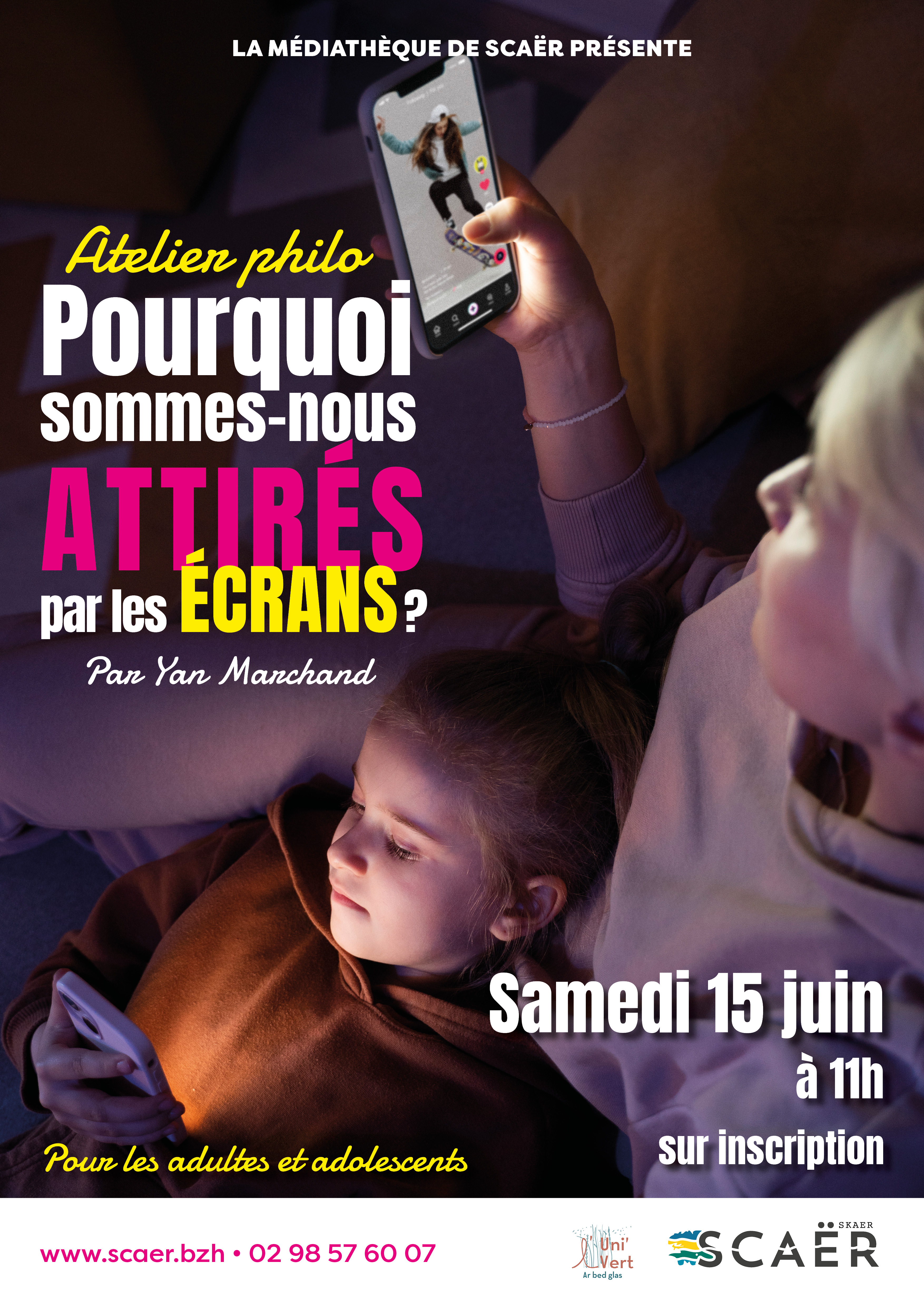 Un autre sujet qui concerne les adolescents est celui de notre exposition du mois de juin nommée « Face aux écrans : leur impact sur notre vie ». Certes les écrans, nous touchent toutes et tous, mais les adolescents sont particulièrement réceptifs à leurs sollicitations. Pour réfléchir ensemble et prendre du recul, nous vous proposons un atelier d’échange et de discussion avec Yan Marchand, philosophe, avec qui nous réfléchirons à la question « Pourquoi sommes-nous attirés par les écrans ? ». Samedi 15 juin à 11h (sur inscription)."