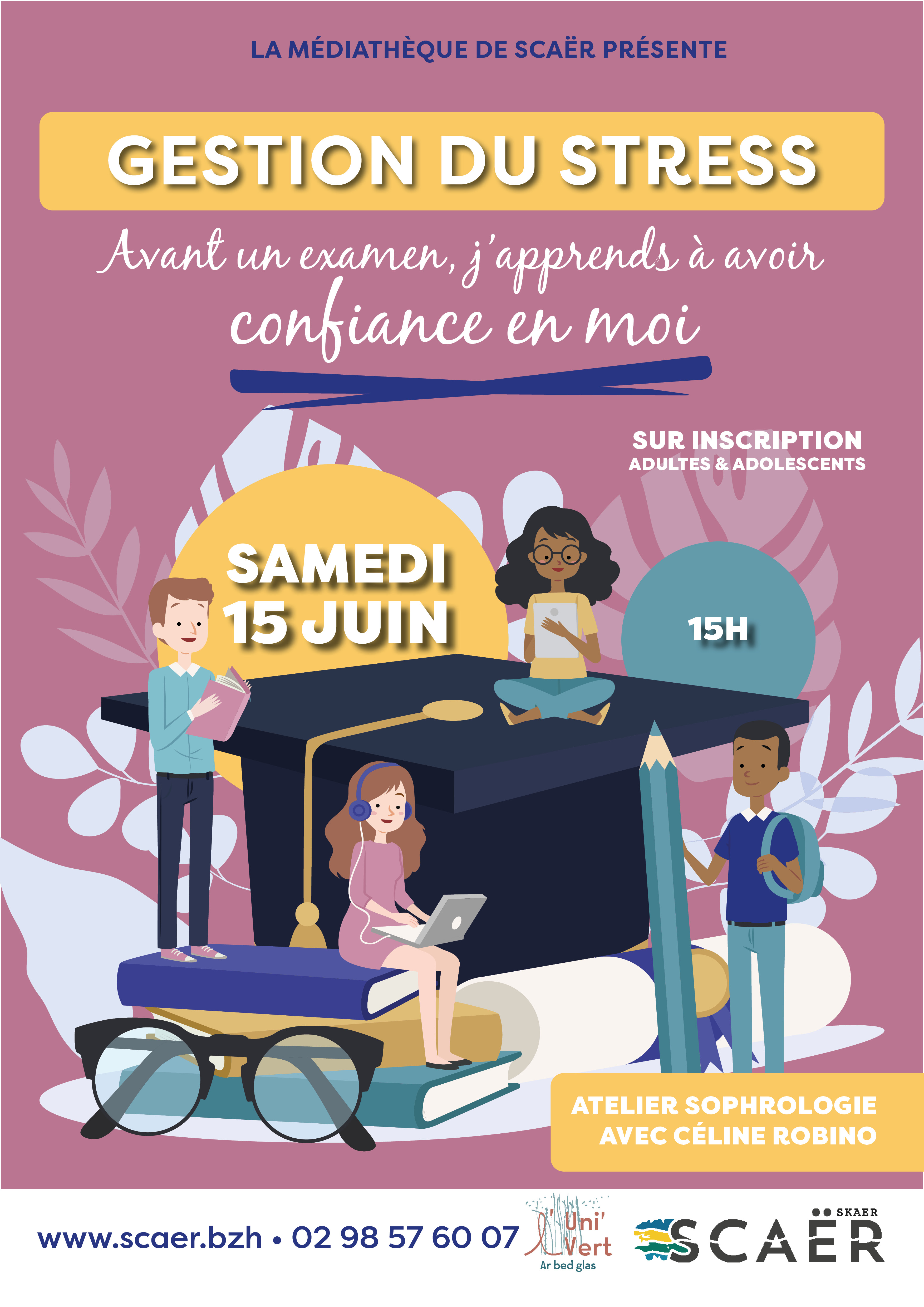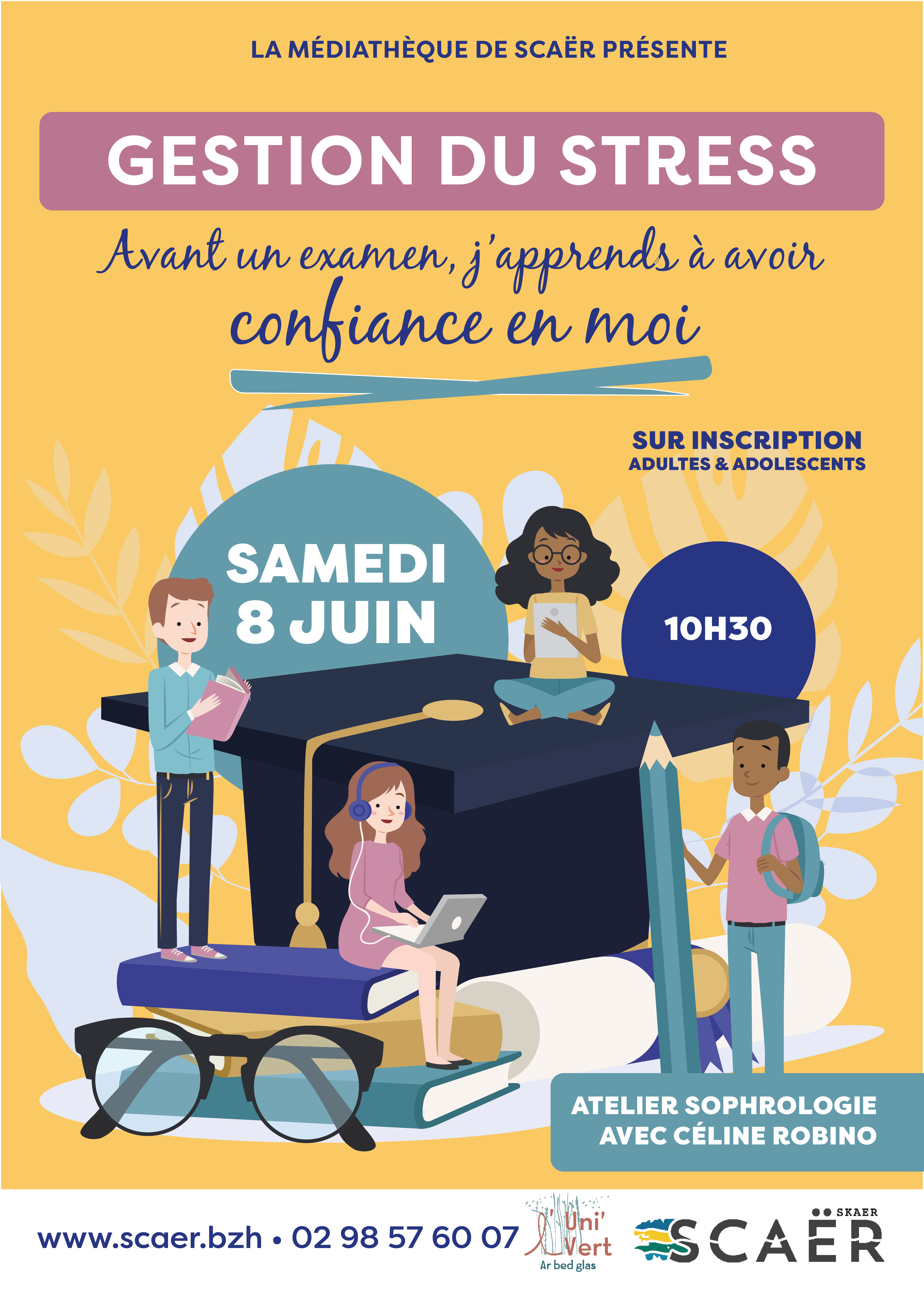 "Il s'agit d'ateliers pour prendre confiance en soi. Mobiliser toutes ses compétences, ses connaissances à l’instant T et savoir garder une parole fluide et conserver une attitude sereine sont des atouts pour les examens et les oraux qui se travaillent en amont. Familière de ces préparations grâce à ses interventions dans les collèges et lycées Céline Robino, sophrologue, pourra aider et accompagner les ados durant les deux séances de sophrologie du mois de juin. Le 8 et le 15 juin. Attention le nombre de place est limité, l’inscription est nécessaire.