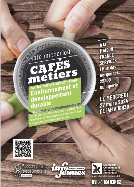 Comment participer ? SUR INSCRIPTIONS auprès du SIJ : infojeunesse@quimperle-co.bzh , 02 98 96 36 86, via les réseaux sociaux ou directement via le site internet : https://www.quimperle-communaute.bzh/actualite/prenez-un-cafe-metier-avec-le-sij/
